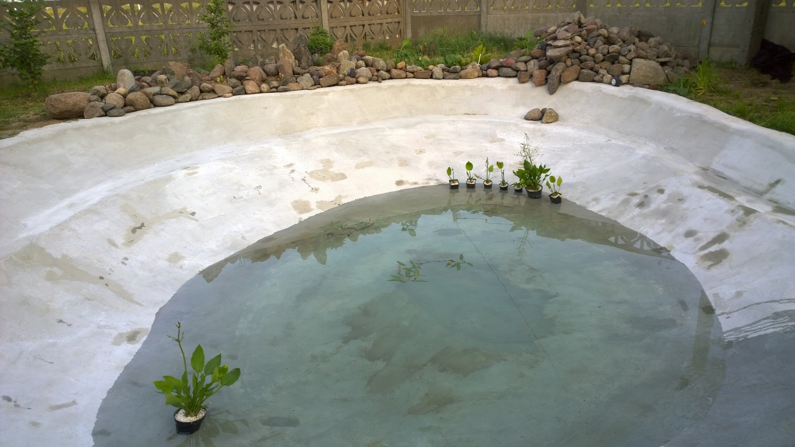 W maju 2018r z pomocą zaprzyjaźnionej firmy wykonującej posadzki miksokretem zbudowałem swoje upragnione oczko z siatkobetonu.
