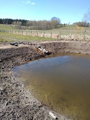 Witam. Mam problem ze świeżo wykopanym stawem. Staw był kopany 3 tygodnie temu. Po wykonaniu dość szybko zapełnił się woda gruntową oraz z drenów (do poziomu który widać na zdjęciach czyli około 1,5 m ) które przez staw przechodzą. Następnie została dolana woda z przelewu ze stawu sąsiada. U niego wody jest aż za dużo. Jego stawek jest położony trochę wyżej w odległości 20 m. Jednak po około tygodniu woda opadła o około 40 cm. Dodam, że ze stawu jest też odpływ. Odpływ jest troche podwyższony w stosunku do drenu, którym ewentualna nadwyzka wody ma uchodzić. Grunt to głównie glina oraz iły. Staw został wykopany w naturalnej niecce gdzie zawsze było podmokło na jesień i wiosnę. Wykonawca twierdzi że brzegi stawu muszą wchłonąć swoje oraz się zamulić i że różnice poziomu wody w początkowym okresie są normalne. Myślicie że ma rację??A jak było u was?? Zdaję sobie sprawę z tego że jest susza i poziom wód gruntowych obniża sie. Postaram się uzupełnić staw w miarę możliwości do pełna.