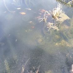 Klarowność czy przejżystość wody jest OK , widać wszystko. Martwią mnie tylko to coś co pływa po wierzchu i te glony co pooblepały ścianki oczka , doniczki ( jak widac na foto ) i rośliny które jeszcze są "suche".